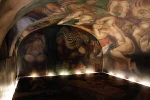 El mexicano, junto a sus ilustres ayudantes, pintó las paredes, la bóveda y el piso del recinto semicilíndrico de unos 150 metros cuadrados y representa un imaginario mundo submarino, de movimientos envolventes.