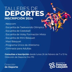 Ocho de las muchas actividades que se realizan bajo la órbita de la dirección de Deporte municipal abren el próximo lunes (26) la inscripción para sus talleres de la temporada 2024: son el Newcom; las escuelitas de Taekwondo Olímpico, Cestoball, Mini Basquet y Voley Formativo Mixto; el Programa Único de Atletismo (PÚA); el Maxi Basquet; y Gimnasia para Adultas algunos de ellos en más de una sede.