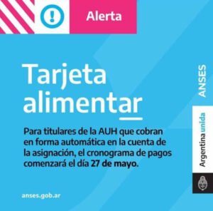 El Ministerio de Desarrollo Social de la Nación informó que el pasado viernes se acreditó el monto de la Tarjeta Alimentar para quienes tienen la tarjeta física, en tanto que para quienes no recibieron la tarjeta, el cobro se hará por la cuenta de la Asignación Universal por Hijo (AUH) a partir del próximo 27 de mayo.