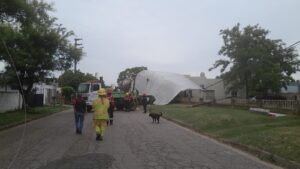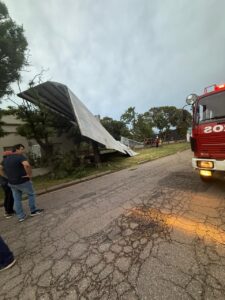 Las fuertes ráfagas de viento causaron el mayor daño en la EP n° 17 donde se voló una gran parte de la estructura de la cubierta, que quedó literalmente sobre la vivienda ubicada enfrente, arrancándose el techo de chapa en un solo gran tramo.