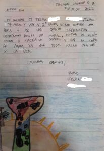 En la carta, que es de una carilla e incluye el texto y un dibujo, la niña explica “se me ocurrió una idea y se las quiero compartir, podríamos hacer un mural, pintar de algún color o hacer un graffiti en la Copa de Agua, ya que todos pasan por ahí y la ven”.
