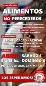 Con la intención de realizar dos o tres obras durante el año, esta vez la colecta se centró en el aporte de alimentos no perecederos. Las donaciones requeridas, principalmente leche larga vida, cacao y otros productos, serán recibidas en la Plaza San Martín este sábado y domingo de 9 a 13 horas, para su posterior distribución entre los merenderos.