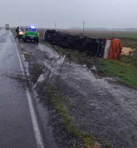 El accidente tuvo lugar cerca de las 18:10 del viernes cuando la lluvia arreciaba sobre nuestra zona y fue protagonizado por un camión marca Volvo con acoplado cargado con trigo conducido por un chofer con domicilio en la localidad de América, partido de Rivadavia.
