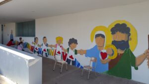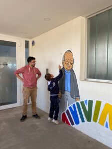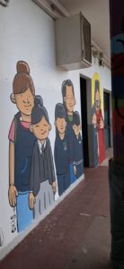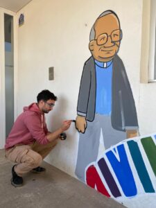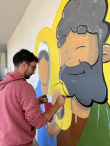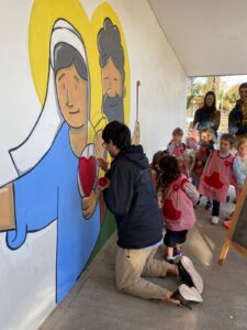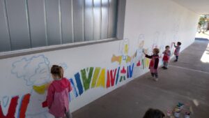 Con la intención de dar vida a una pared del jardín de infantes, la representación legal del colegio propuso la creación de un mural. La idea era plasmar los valores de la institución y, al mismo tiempo, generar un espacio que invitara a la reflexión y la participación. Para ello, convocaron al artista Cristian Camargo, un misionero itinerante nacido en Mar del Plata que evangeliza a través del arte, haciendo murales por la paz y la esperanza.
