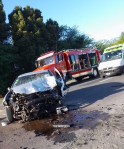 Este domingo alrededor de las 17:00 se produjo un violento choque frontal por alcance en el km 127,300 de la ruta 5, entre un automóvil Chevrolet Spin, color gris (Dominio Af 196 HF) que circulaba en sentido Mercedes/ Chivilcoy, y un automóvil Volkswagen Golf que circulaba en sentido contrario.
