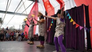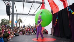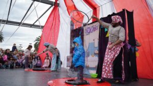 La jornada comenzó a pura energía con la presentación de La Vejentud Murguera, que marcó el ritmo de la tarde con su música y colorido. Luego llegó el turno del Circo Criollo Infantil de Barrio Alegre, que desplegó danza y destrezas para el disfrute de grandes y chicos. En el escenario principal, ubicado en la Pérgola, el grupo porteño La Tropezón brindó un show que combinó circo, magia y humor, sorprendiendo al público con una propuesta innovadora y divertida.