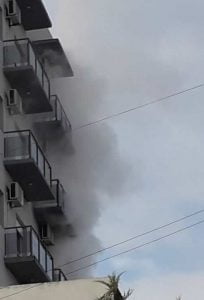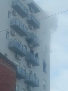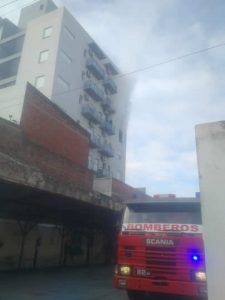 En este momento están evacuando a todas las personas que habitan el edificio hacia la calle para mantenerlos a resguardo del denso humo que prolifera por pasillos y escaleras, y se mete en otros departamentos.
