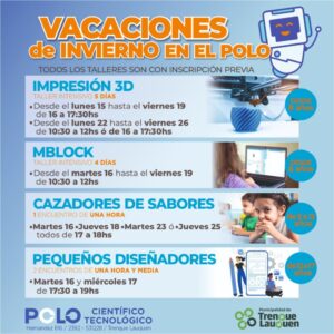 Cuatro talleres orientados especialmente a los niños/as: Impresión 3D, Mblock, Cazadores de Sabores y Pequeños Diseñadores, forman parte de la propuesta del Polo Científico Tecnológico Municipal, que funciona en Hernández nº 816, para estas vacaciones de invierno.