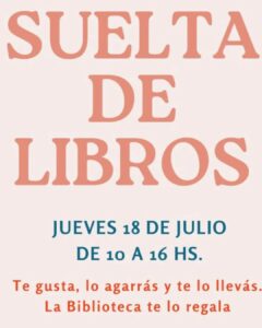 – El jueves 18 de 10hs a 16hs suelta de libros. Bajo el lema “Vení, elegí el que te guste y te lo regalamos” donde cada persona pueda pasar y llevarse un libro de regalo.