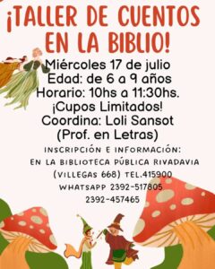 – El martes 16 y miércoles 17 de 10hs a 11.30hs para los niños a partir de 6 a 9 años. Taller de cuentos a cargo de la docente Loli Sansot, destinados al espacio de creatividad y lectura de cuentos.
