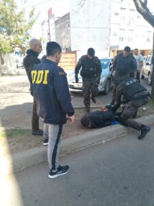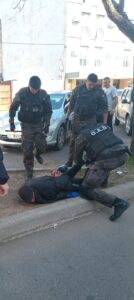 De manera simultánea, y cuando el jefe del GAD, Comisario Juan José Ustarroz, circulaba en su vehiculo particular, logra divisar sobre calle 9 de Julio entre Villegas y Roca de esta ciudad al sindicado quien se movilizaba caminando, lo intercepta, reduce y demora para dar luego aviso de la situación al resto del personal, fines se cumplimente con la requisa.