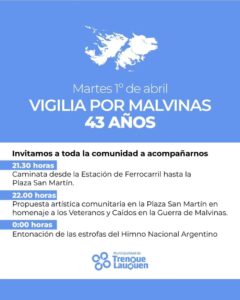 Por primera vez en Trenque Lauquen y en una actividad impulsada por el Municipio y artistas locales, mañana se realizará una Vigilia por Malvinas, que comenzará a las 21.30 con una caminata desde el Playón de la Estación por la Avenida Villegas hasta la Plaza San Martín, donde se escucharán poemas, testimonios, relatos y música para recordar, reflexionar y rendir homenaje a los caídos y ex combatientes en la previa del 2 de Abril, Día del Veterano y los Caídos en la Guerra de Malvinas.