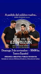 El espectáculo, organizado por la Biblioteca Rivadavia, será el domingo 3 de noviembre a las 20 hs. La comedia humorística “Érase una vez el lobizón”, es ganadora del Festival Regional de Teatro Independiente realizado este año en Trenque Lauquen. Se trata de una disparatada comedia donde tres actores tendrán que contar, sorteando diferentes inconvenientes, la leyenda del séptimo hijo varón que se convierte en lobo. Tomando como base el film “Nazareno Cruz y el lobo”, de Leonardo Favio, y a través de diferentes escenas, el espectador va a ir conociendo la historia del matrimonio Cruz y su desgraciado hijo Nazareno, que al haber nacido séptimo es víctima de un sortilegio: en las noches de luna llena, se transforma en lobizón.