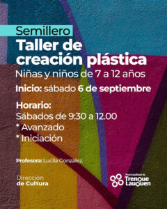 . Semillero, taller de creación plástica: Para chicos/as de 7 a 12 años. Está a cargo de Lucila González y se dicta los días sábados de 9.30 a 12.
