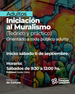 . Iniciación al Muralismo: está dirigido a personas adultas. Contempla contenidos teóricos y prácticos. Está a cargo de Isaías Mata y también se dicta los sábados de 9.30 a 12. Comienza el sábado 6/9.