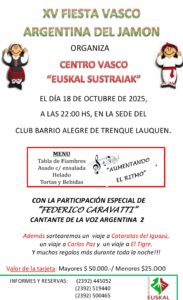 El Centro Vasco “Euskal Sustraiak” organiza la XV edición de la Fiesta Vasca — Argentina del Jamón, que se realizará el sábado 18 de octubre de 2025 a las 22:00 en la sede del Club Barrio Alegre de Trenque Lauquen. La velada contará con un menú tradicional que incluye tabla de fiambres, asado con ensalada, helado, tortas y bebidas, y la animación musical a cargo de “Aumentando el ritmo”.
