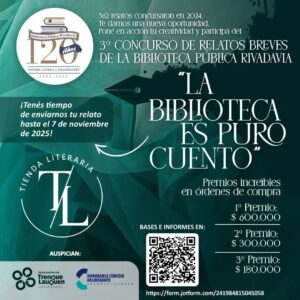 Este año la competencia de escritura conocida como “La Biblioteca es puro cuento” repartirá más de un millón de pesos en premios en órdenes de compra. Cuenta con el auspicio de Tienda Literaria, relevante empresa local que ha apoyado el certamen desde la primera edición. Además, ha sido declarado de interés por el Honorable Concejo Deliberante y el Municipio, quienes también han estimulado a la comunidad para participar en el concurso desde su origen en 2023.