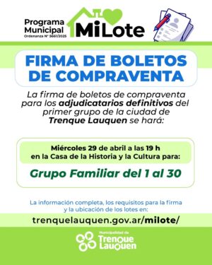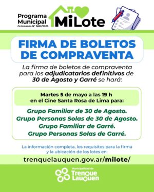 La Municipalidad de Trenque Lauquen dispuso que la firma de los boletos de compraventa de los adjudicatarios definitivos de los terrenos del Programa “Mi Lote” para la construcción de viviendas, se realizará en tres actos previstos para el 29 y 30 de abril en la ciudad de Trenque Lauquen y el 5 de mayo en 30 de Agosto, con la presencia del intendente Francisco Recoulat.