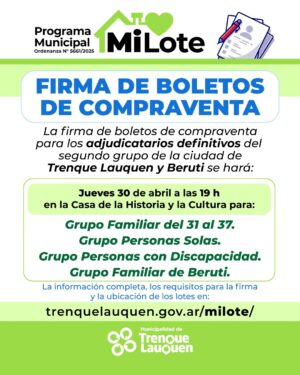 Los adjudicatarios definitivos de las ciudades de Trenque Lauquen y Beruti firmarán los boletos de compraventa los días miércoles 29 y jueves 30 de abril a las 19 h en la Casa de la Historia y la Cultura, ubicada en el Parque Municipal “Conrado Villegas”, en la esquina de Belgrano y Scalesse.