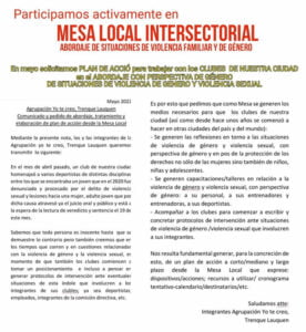 La Agrupación “Yo Te Creo” de Trenque Lauquen pidió que la mesa local intersectorial realice un “abordaje, tratamiento y elaboración de un plan de acción con perspectiva de género en los clubes de la ciudad para los casos de violencia familiar y violencia de género”.
